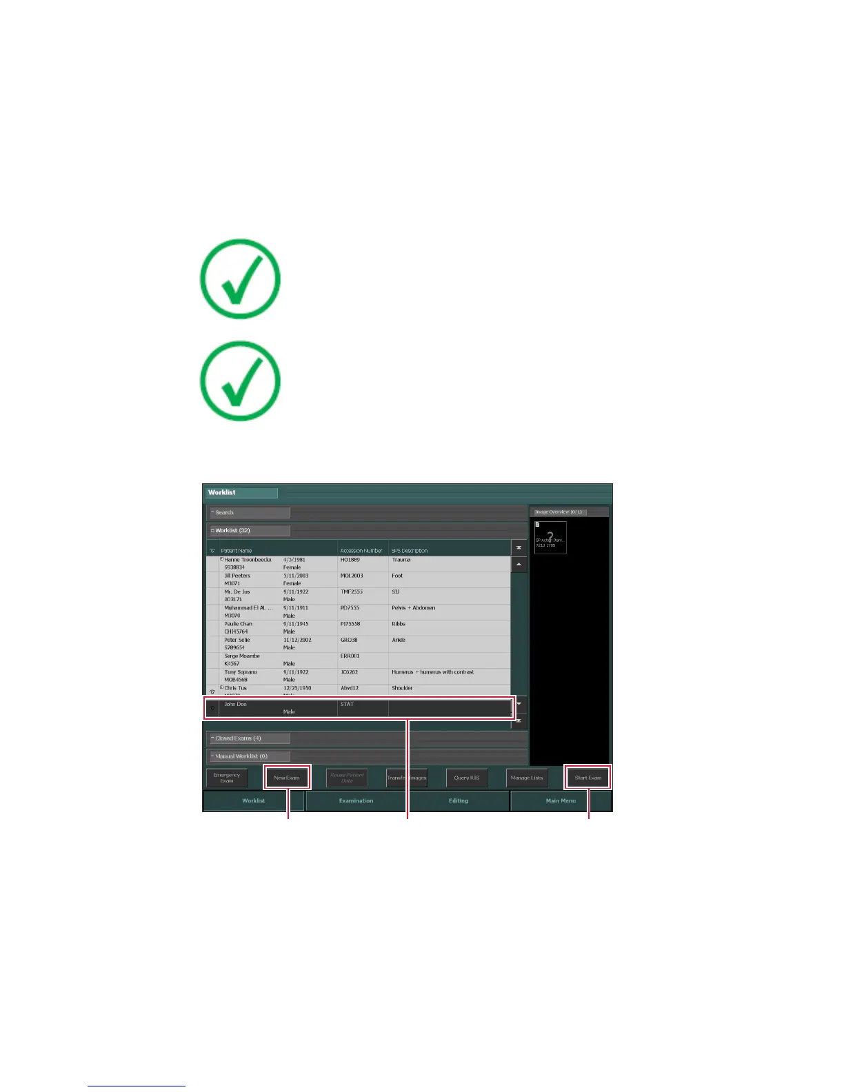 In the Worklist window, you can view and manage the exams that are