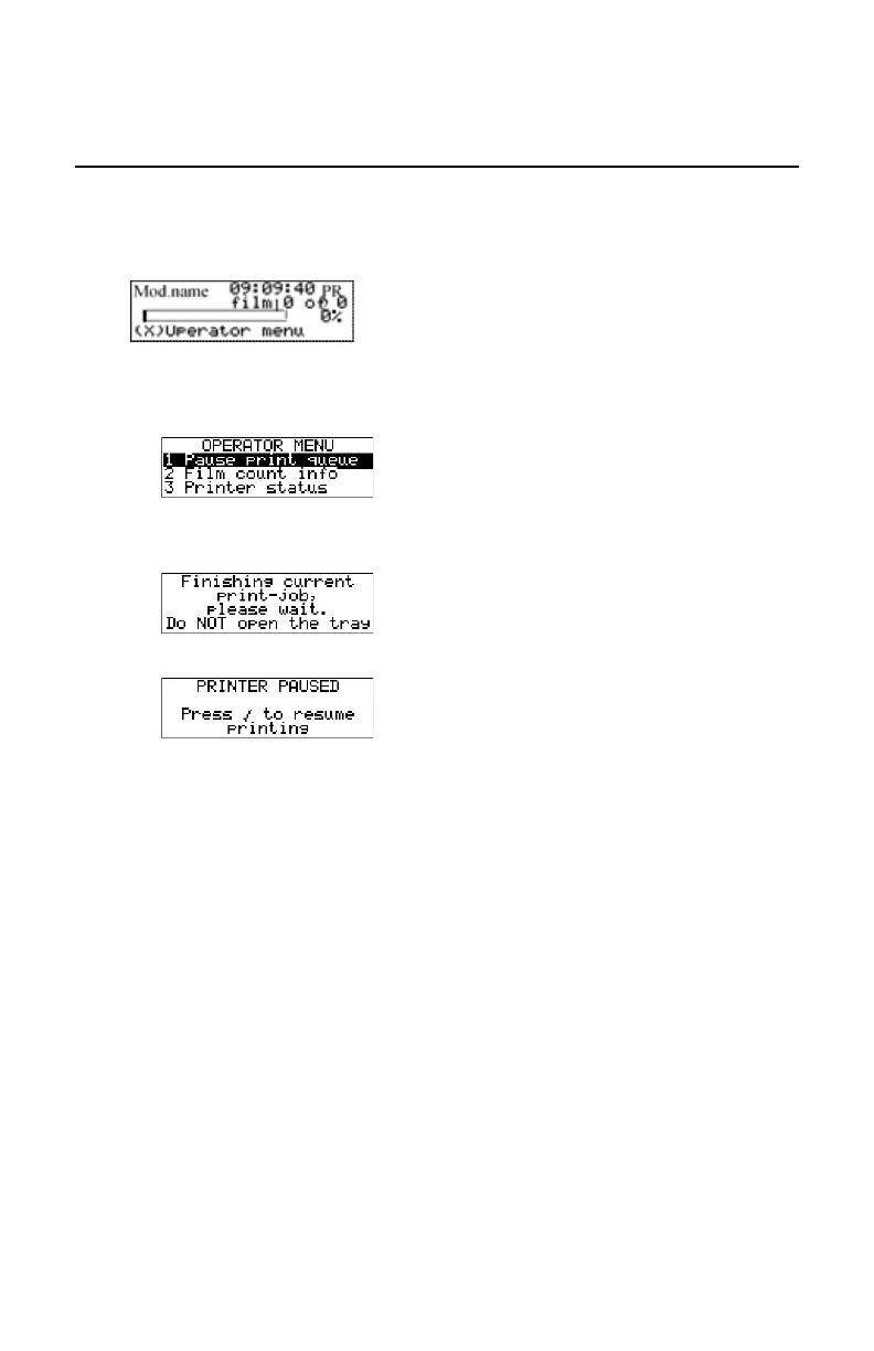 2. On the Operator menu press the Confirm key to select ‘Pause print queue’.