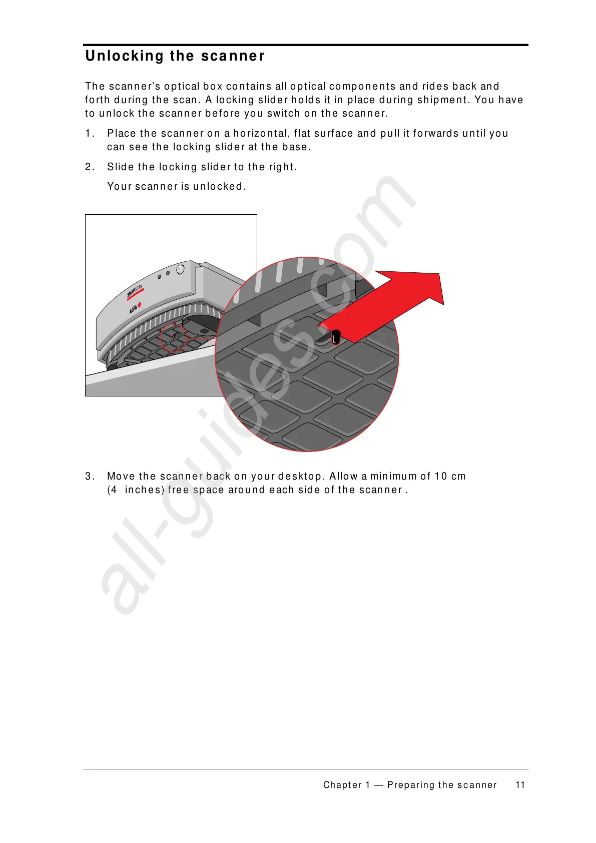 1. Place the scanner on a horizontal, flat surface and pull it forwards until you