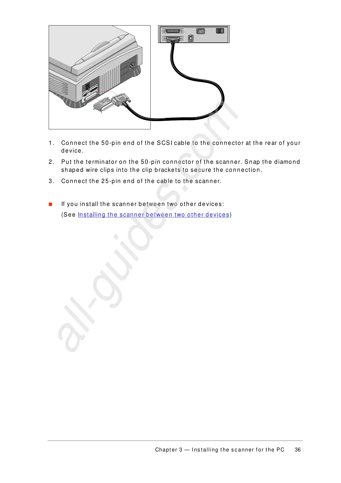 2. Put the terminator on the 50-pin connector of the scanner. Snap the diamond