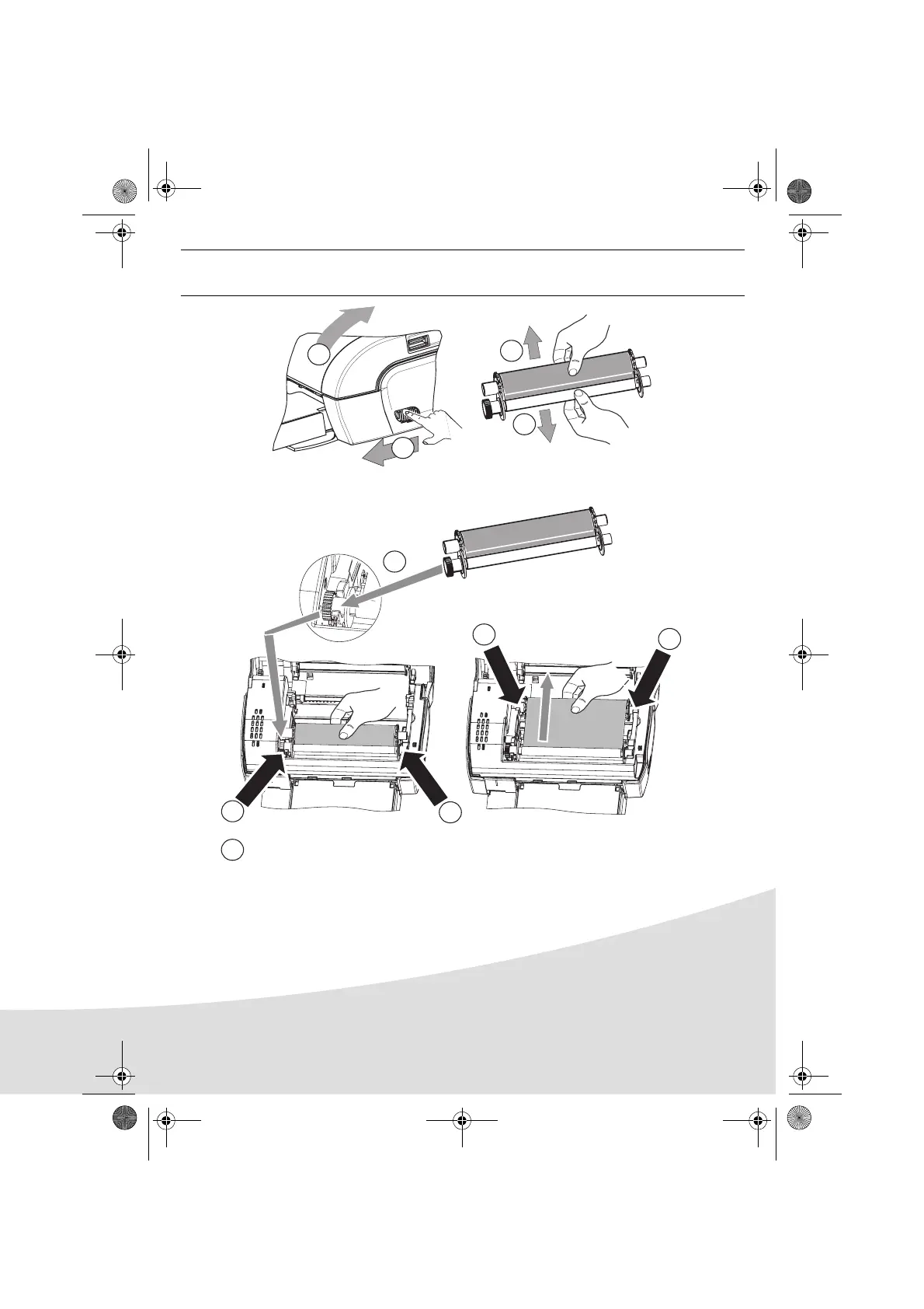 Naciągnąć taśmę na osiach (6) i zamknąć drukarkę.