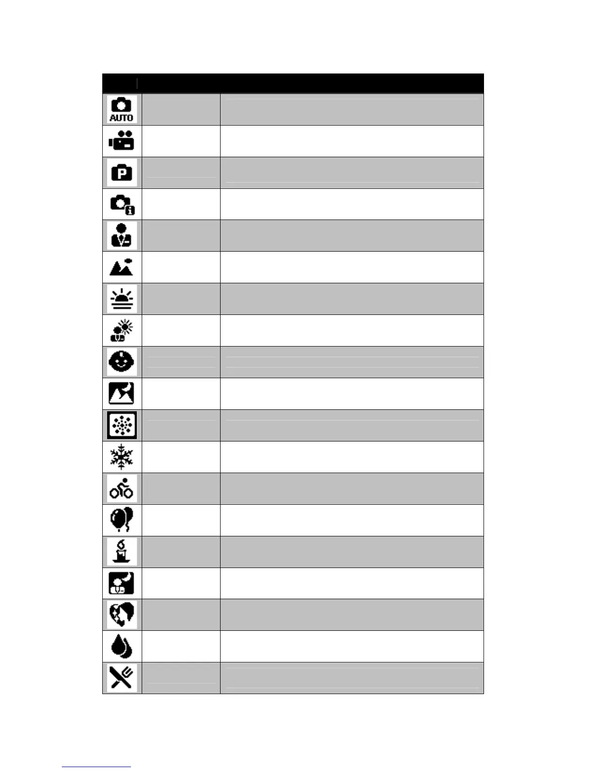 The table below shows the available scene mode settings.