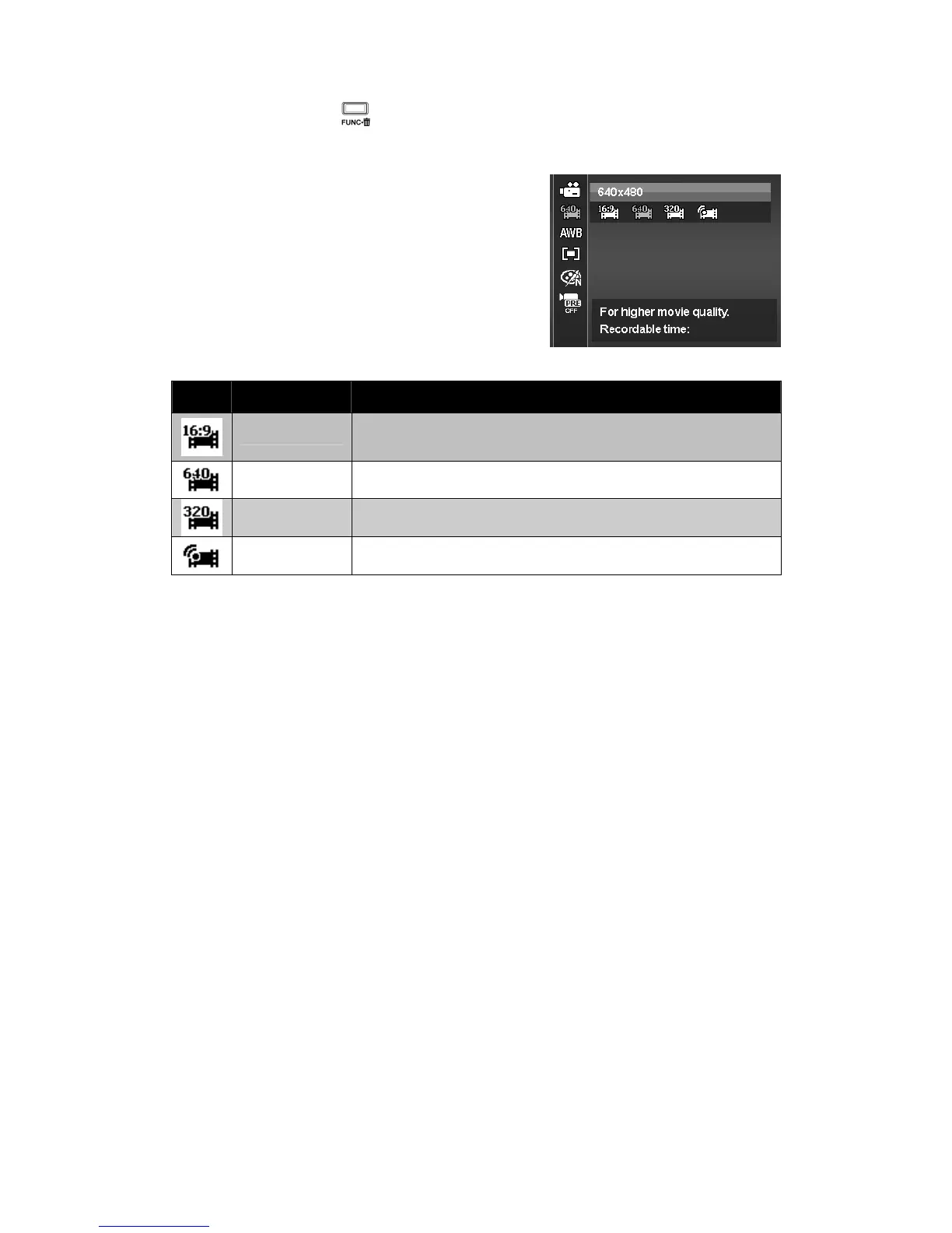 • To record a YouTube® video, select from the Movie Size function. Available recording time for