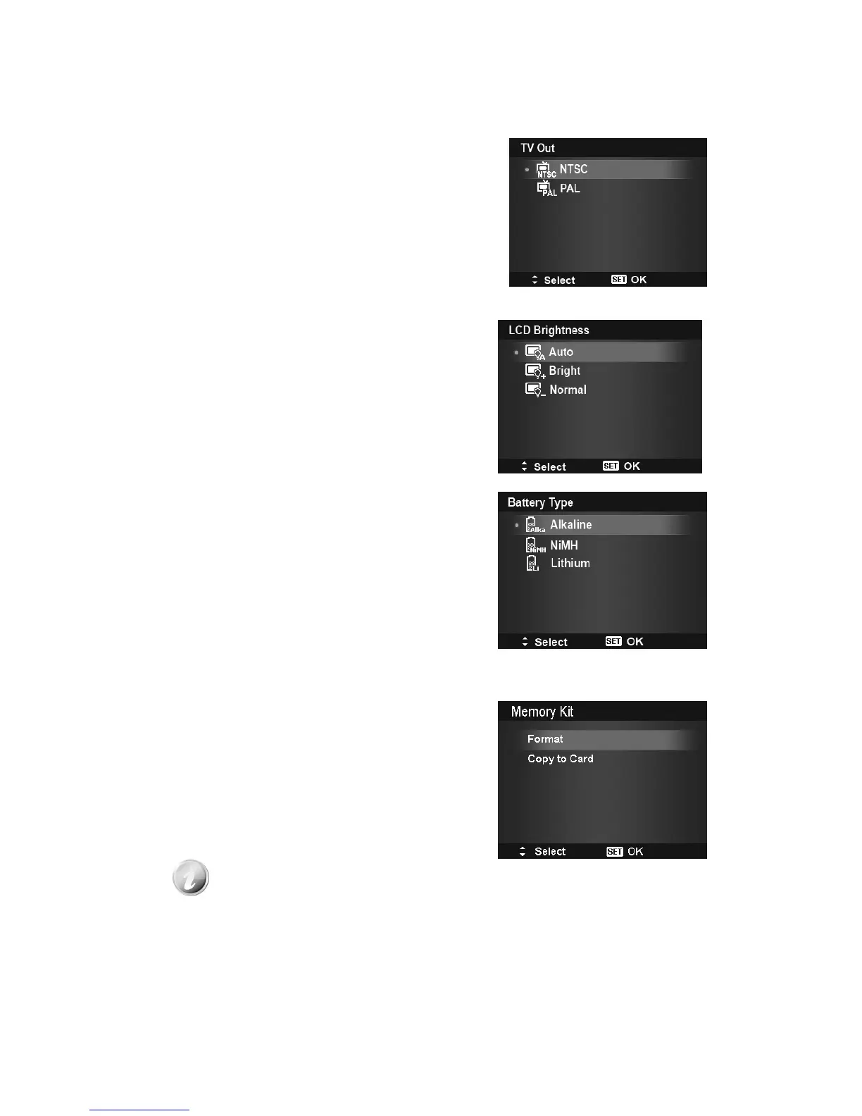 Use the TV Out function to adjust video output signal to accommodate different regional settings. If