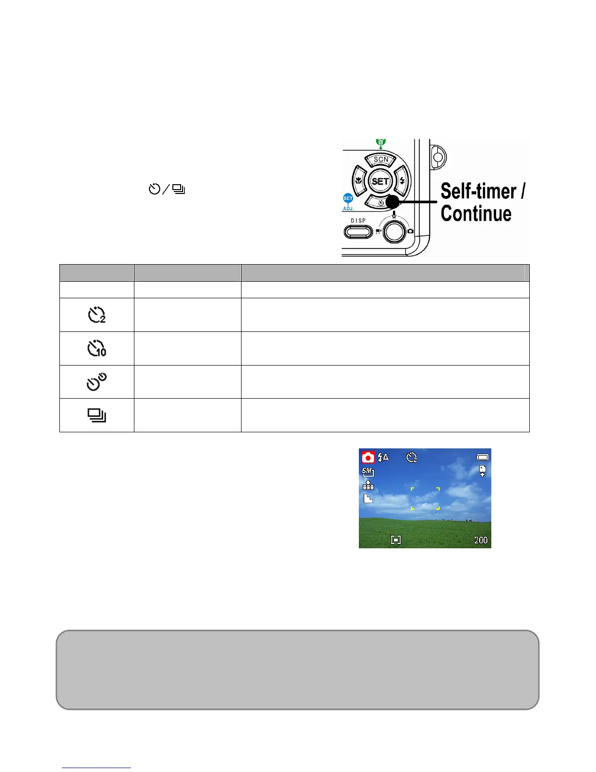2-SEC The shutter release will be delay for 2 seconds.