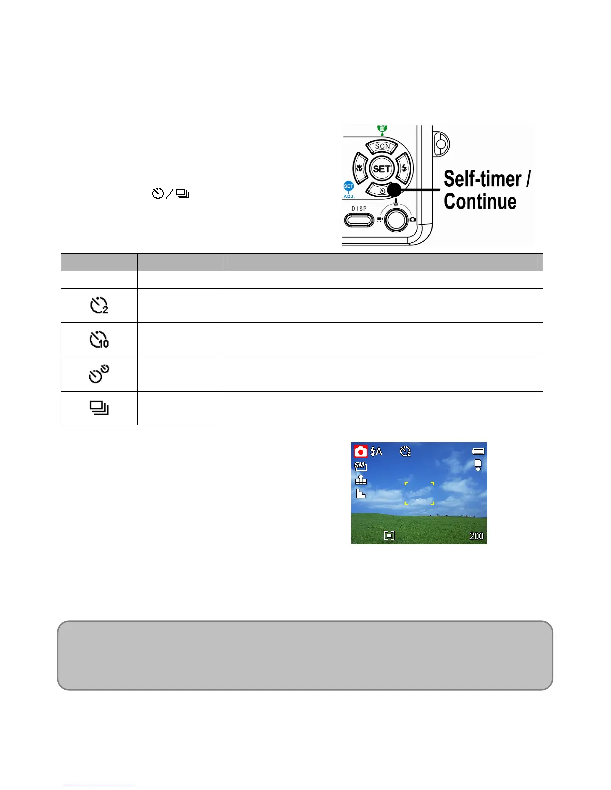 2-SEC The shutter release will be delay for 2 seconds.