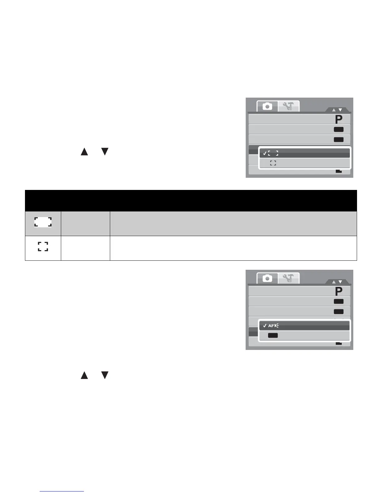 The table below shows the available AF area settings.