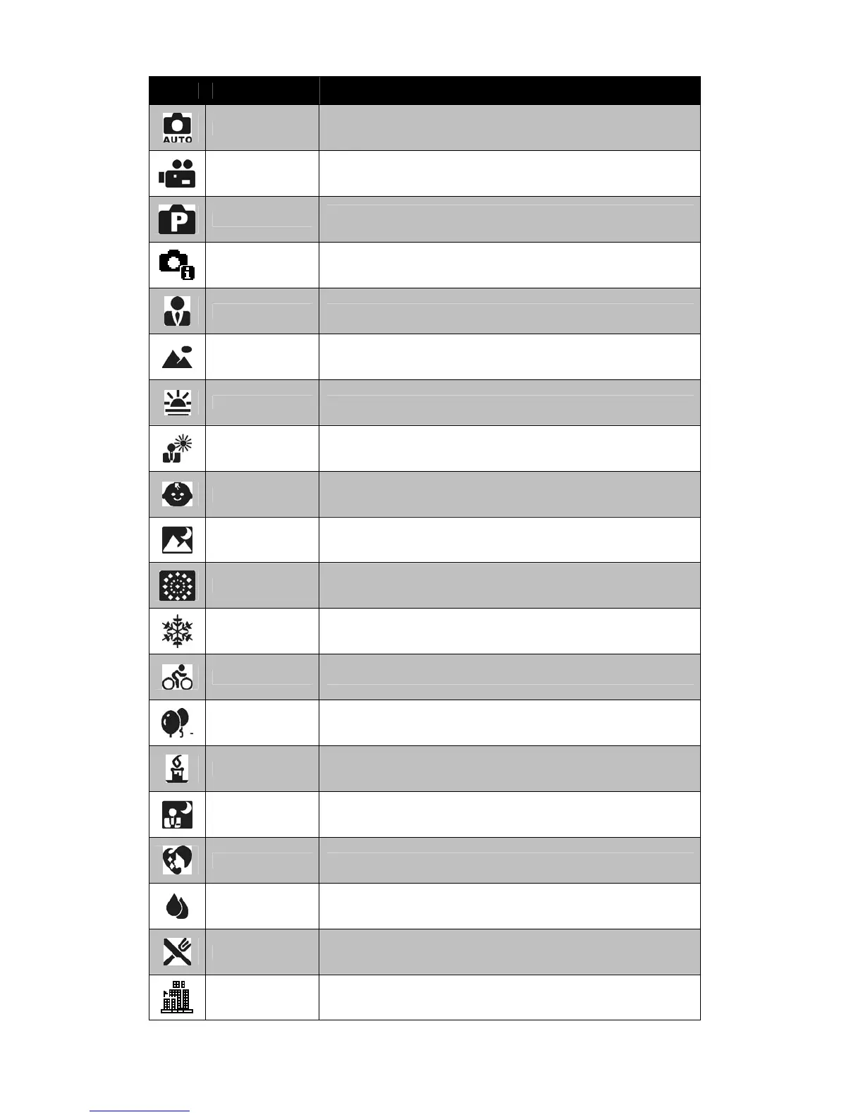 Sunset This feature enhances the red hue for recording sunset images.