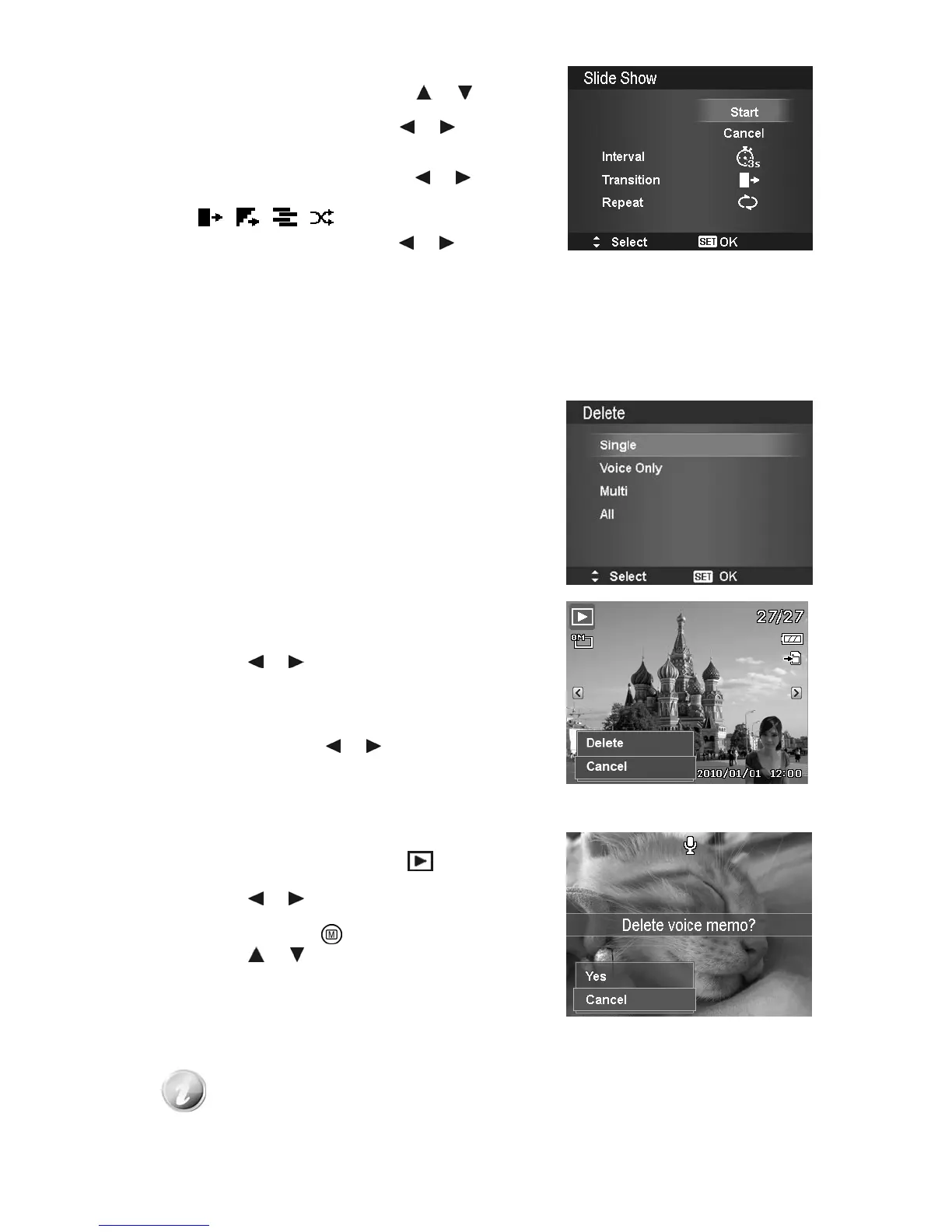 The Delete function allows to remove unwanted files in the internal memory or on the memory card.