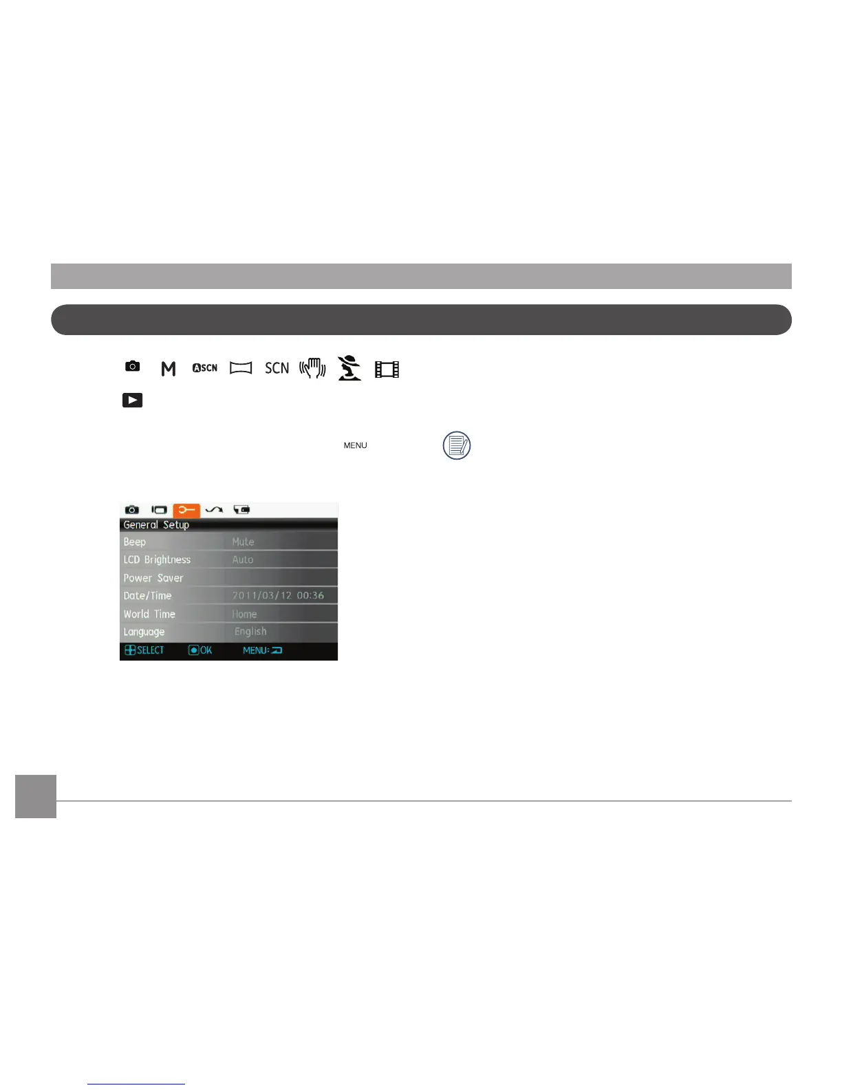 The Setup menu for the camera is available in all modes.