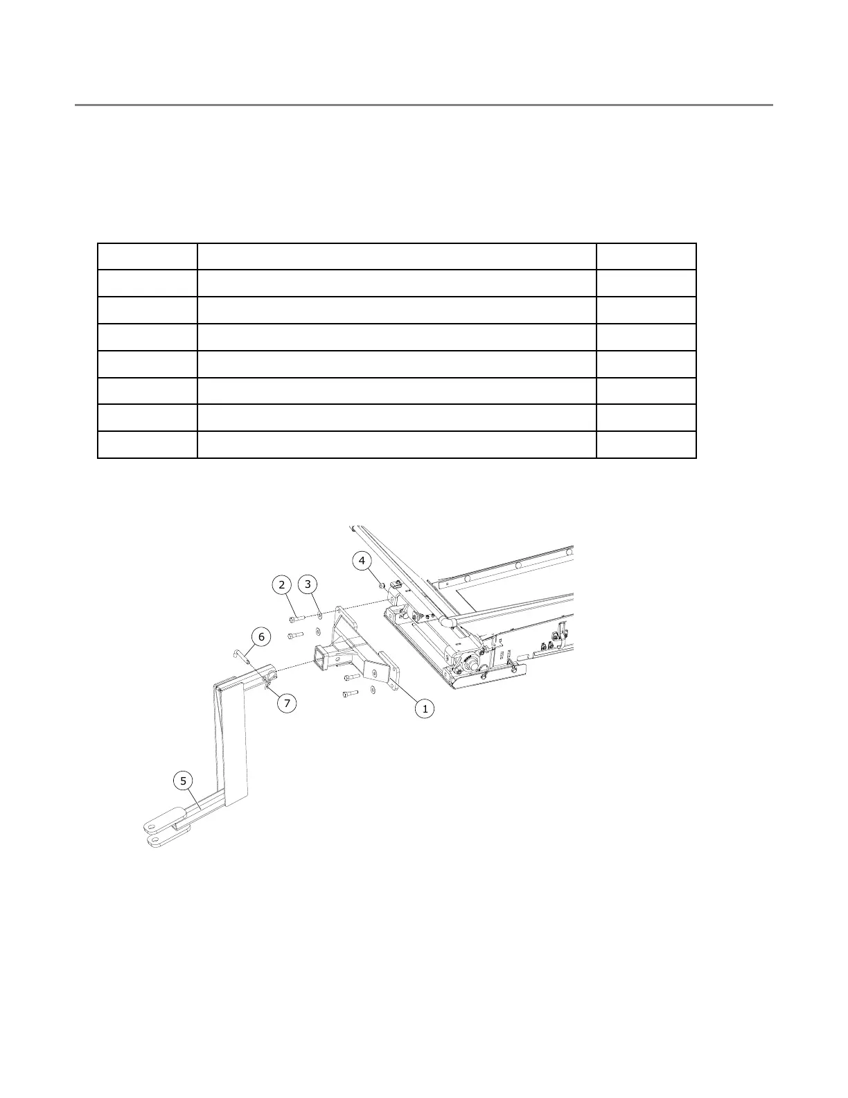 1. Attach the hitch (1) to the hopper weldment using 1/2" x 2" bolts (2), 7/16" flat washers (3), and 1/2" nuts