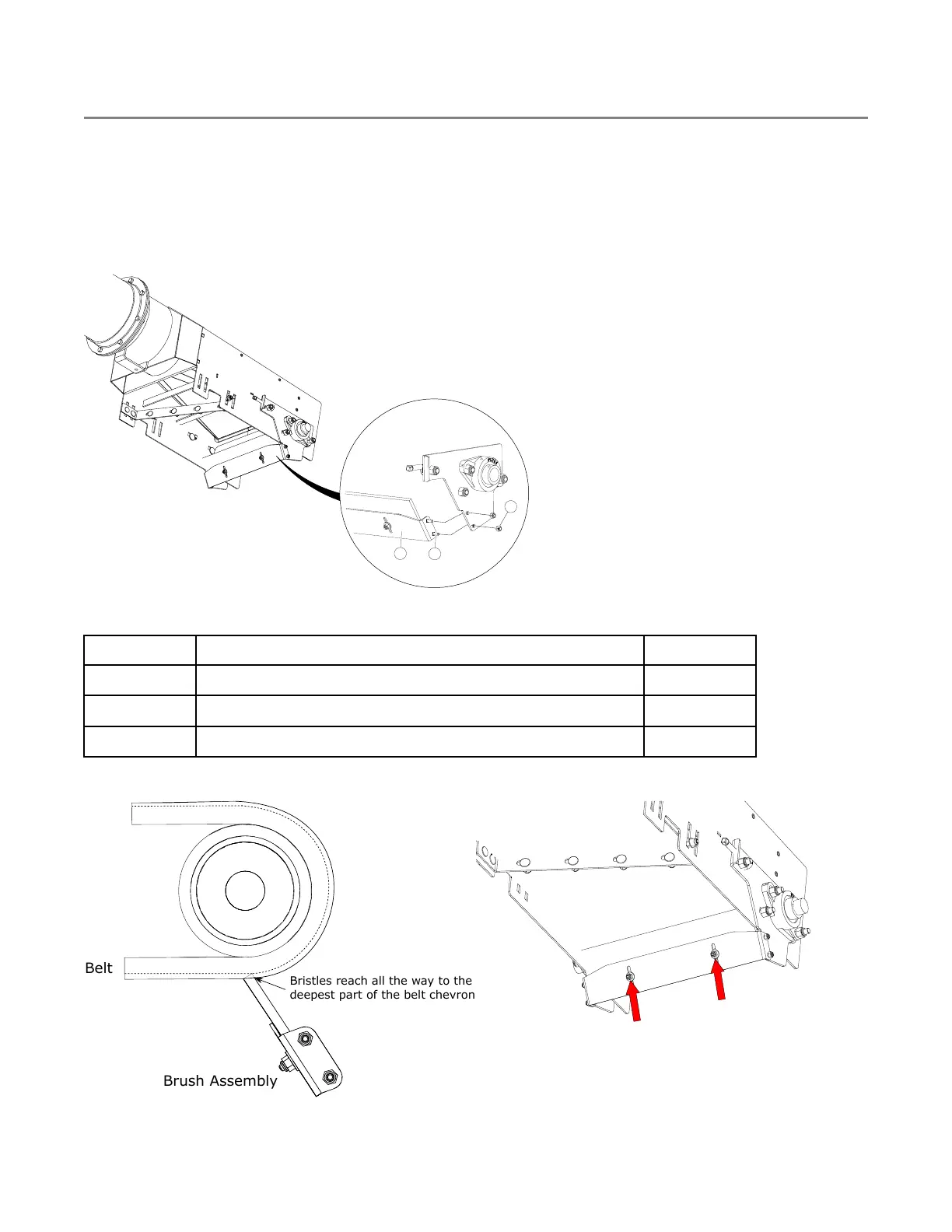 1. Attach the brush (1) to the roller plates with 1/4" x 3/4" carriage bolts (2) and 1/4" lock nuts (3).