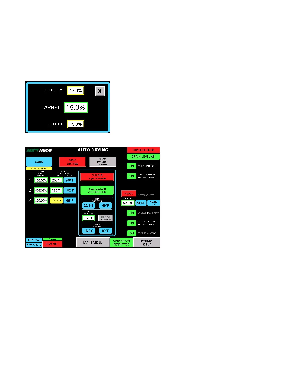 Maximum alarm setpoints for the outlet grain.