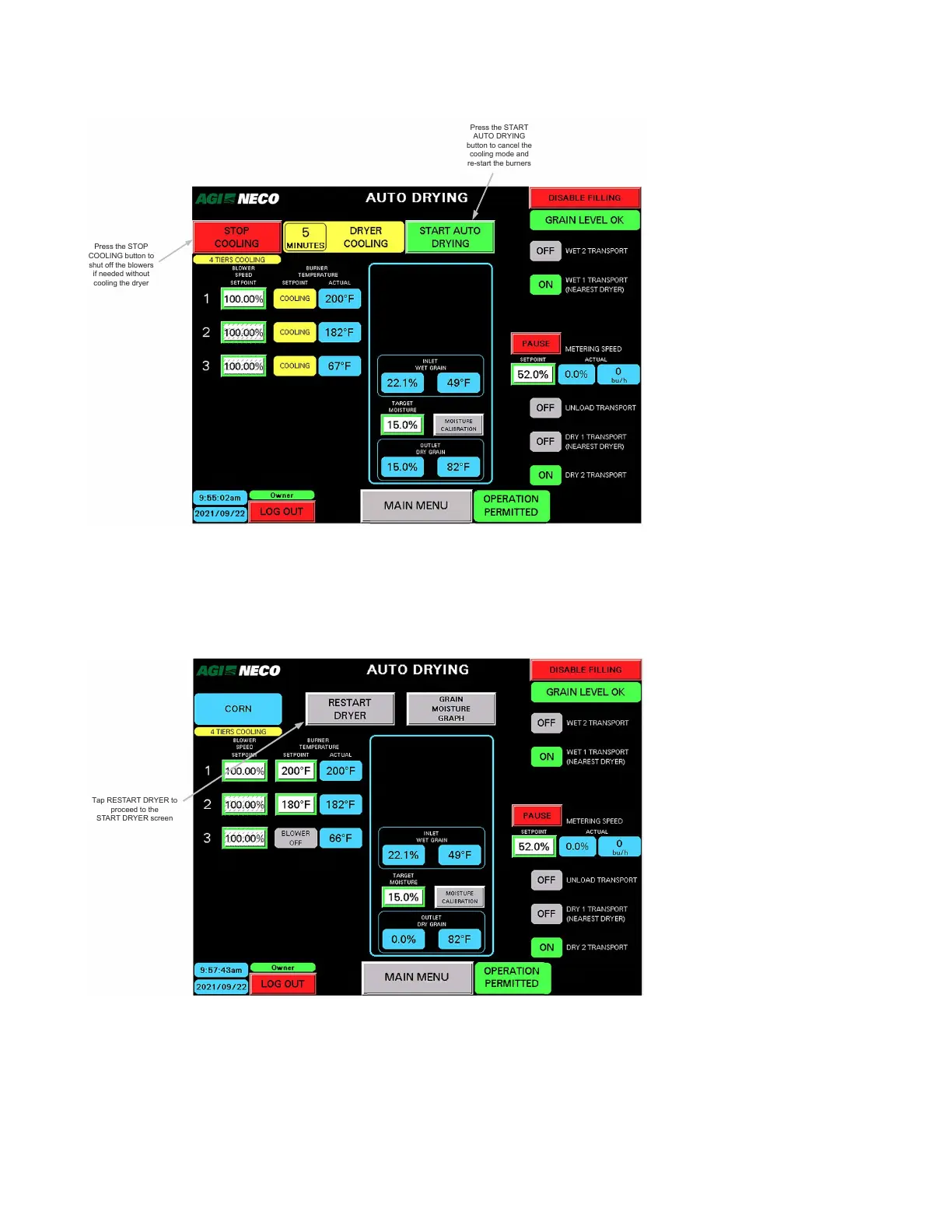 Tap RESTART DRYER to go to the START DRYER MAIN screen. This enables continuation of drying using either