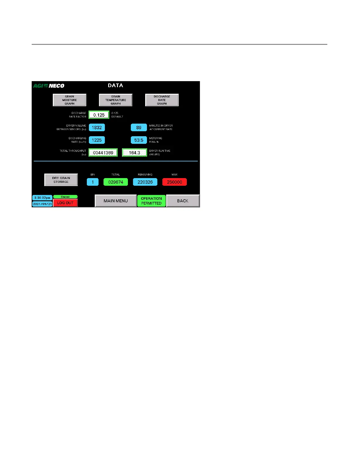 • Volume of grain run through the dryer. Note this value increases with or without grain when the metering
