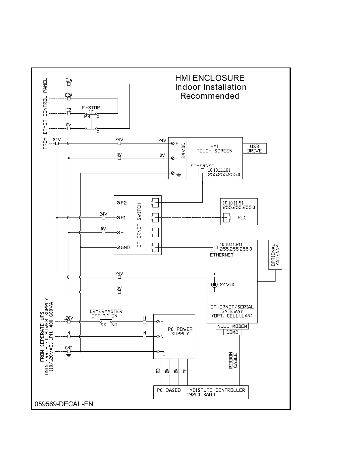 The following diagram shows electrical and Ethernet wiring entering the HMI enclosure (dashed lines).