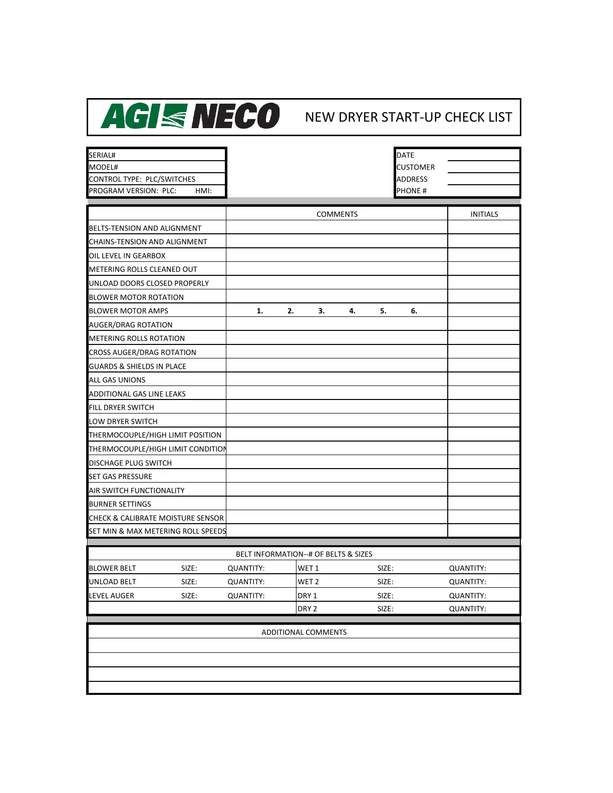 NEW DRYER START-UP CHECK LIST