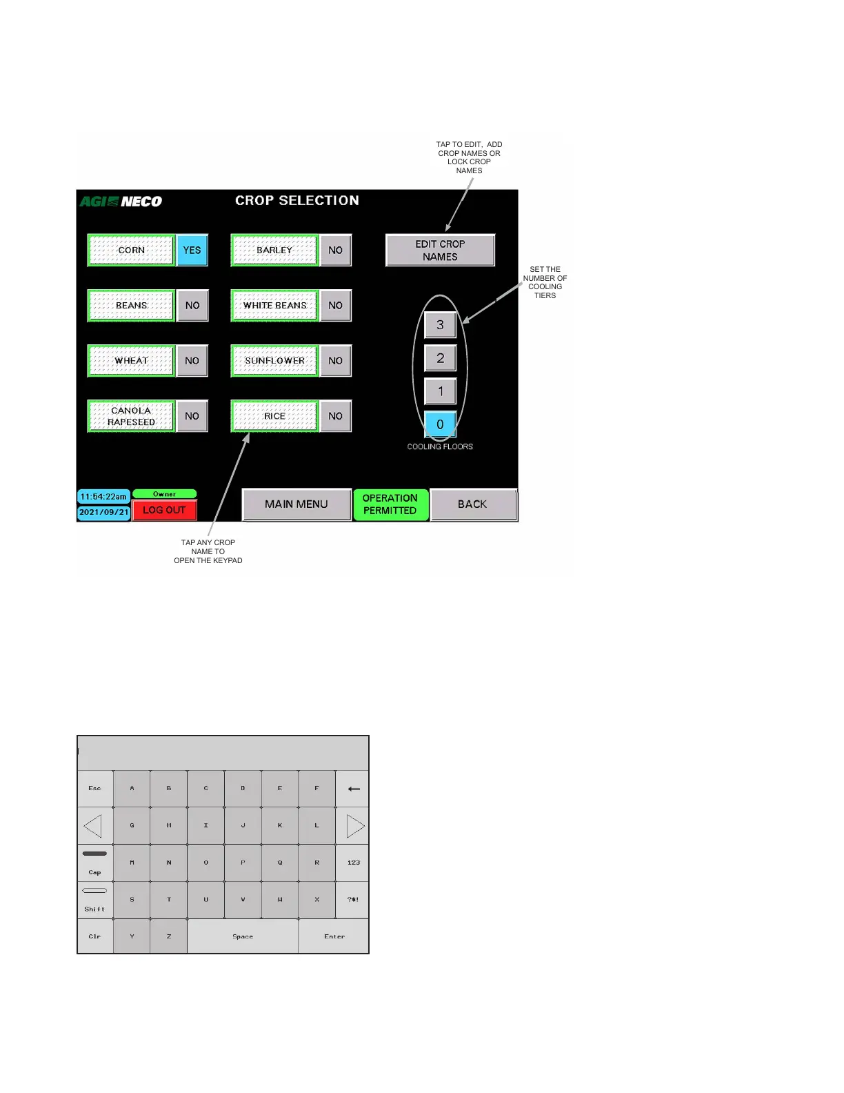 • Tap any crop name button to be changed. The alpha-numeric keypad appears. The current crop selection is
