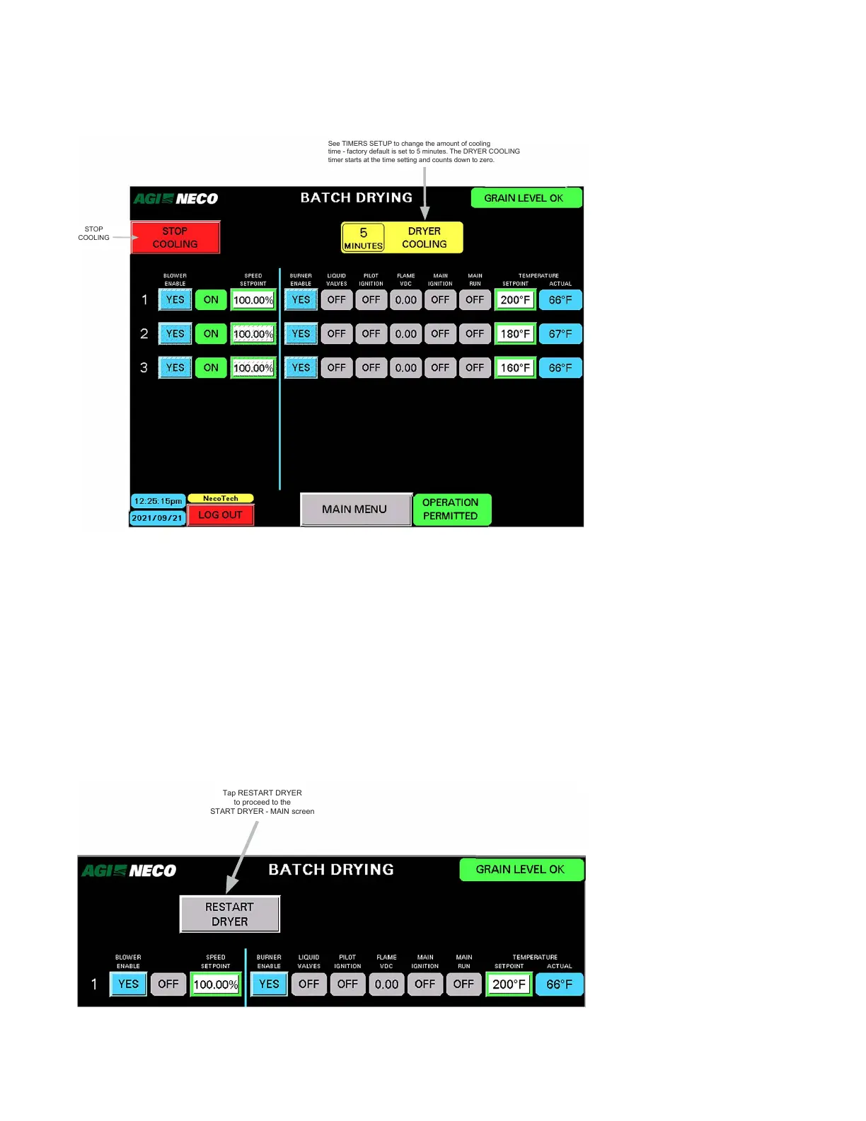 • Tapping STOP COOLING shuts down all blowers. The RESTART DRYER button appears.