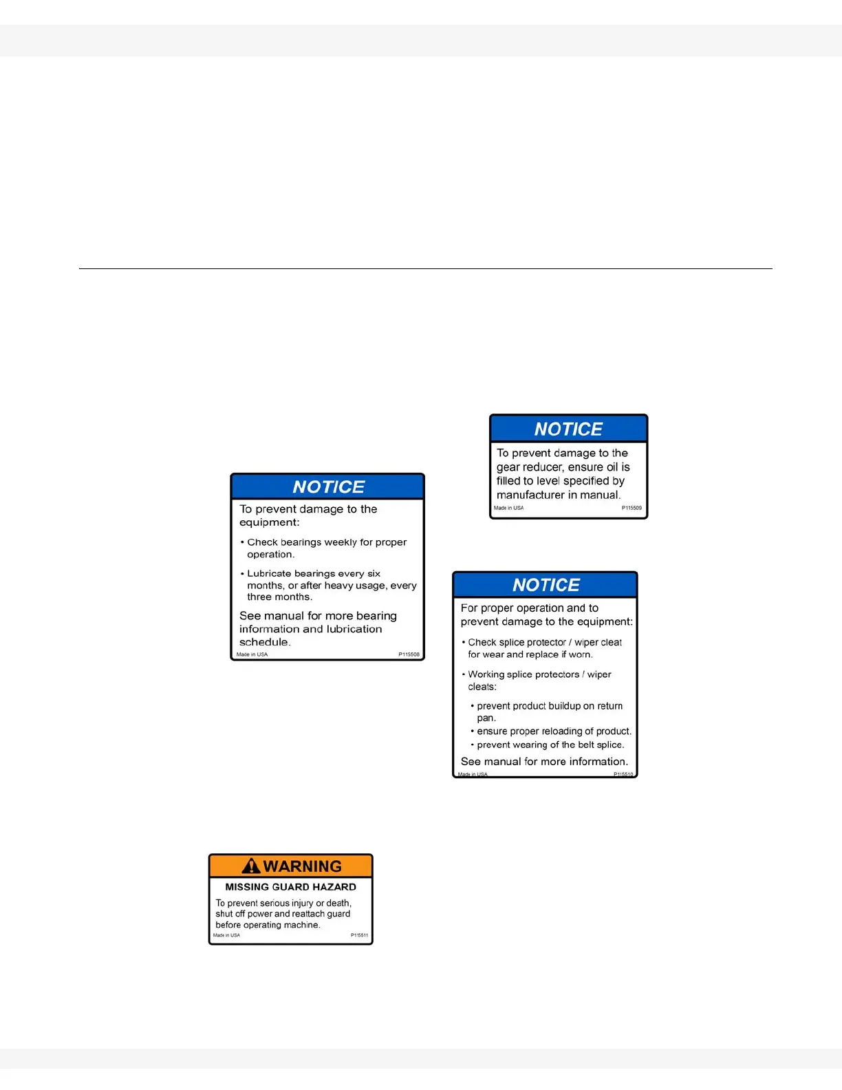 Replicas of the safety decals that are attached to the equipment and their
