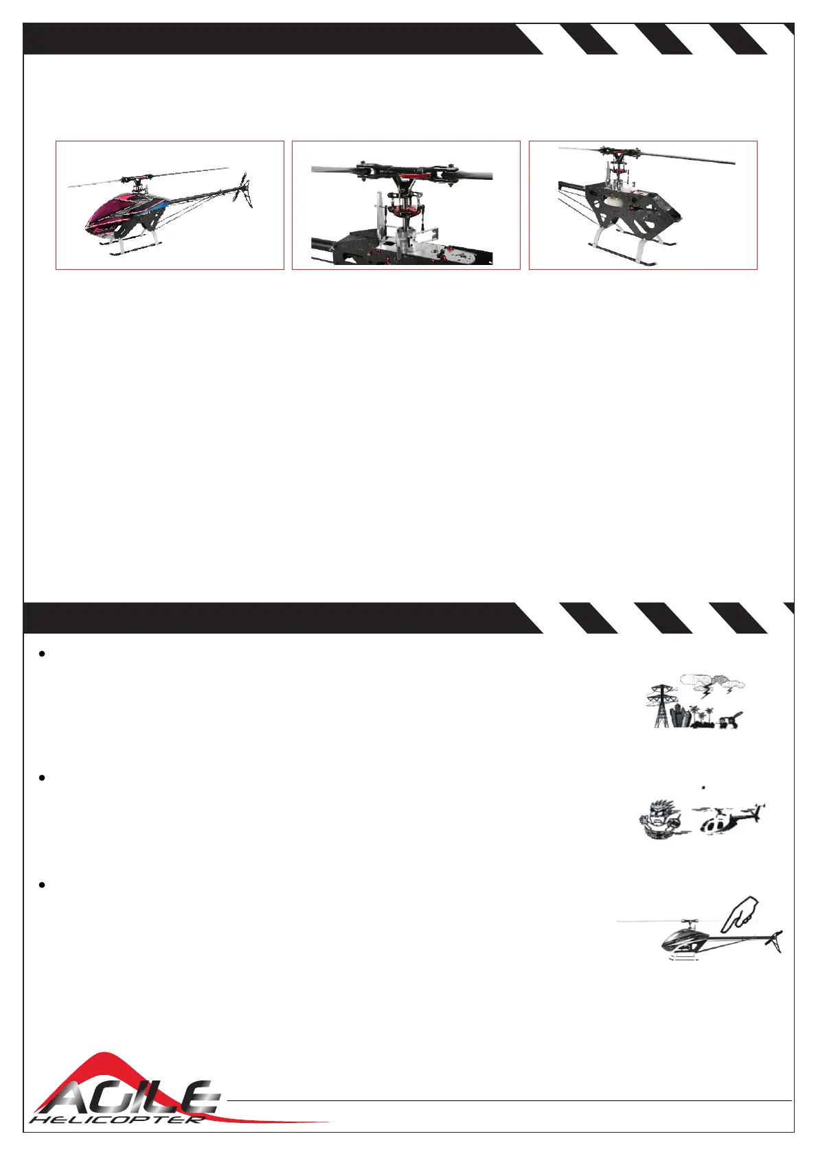 R/C helicopters fly at high speed, thus posing a certain degree of potential danger. Choose an