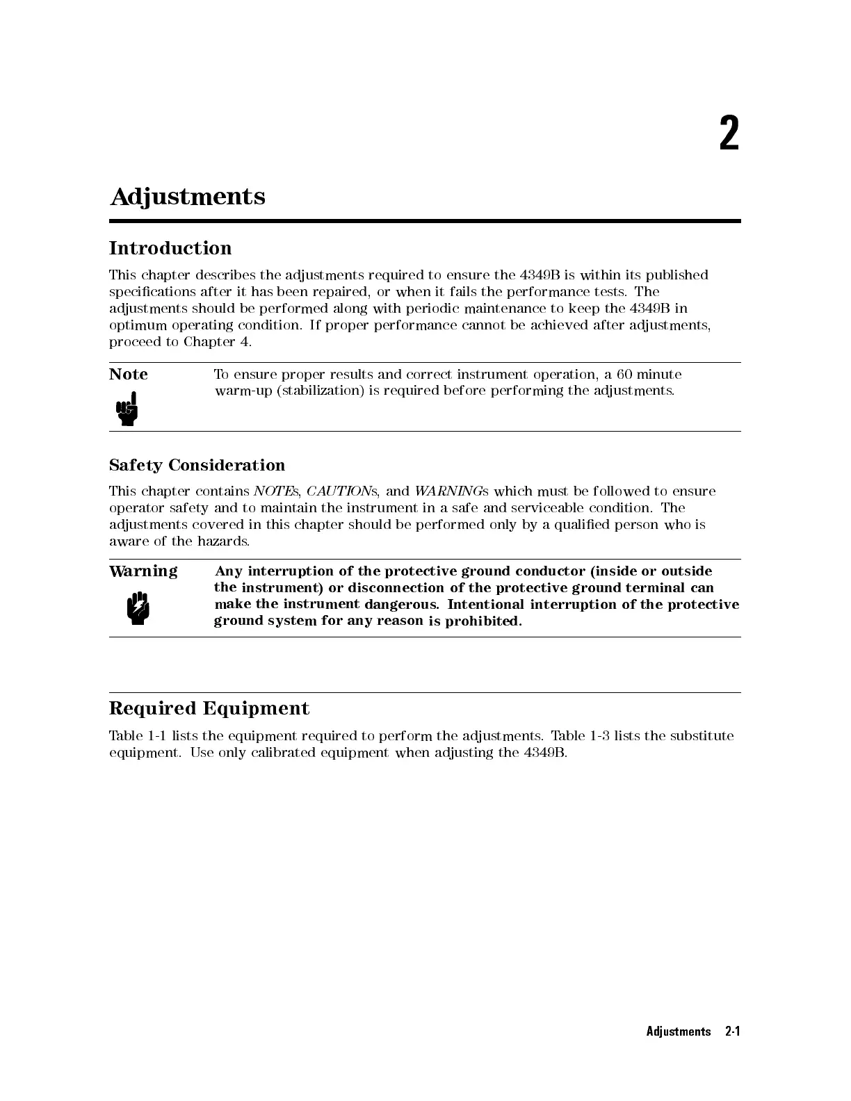 Agilent Technologies 4349B - Adjustments Introduction; Safety Consideration; Required Equipment
