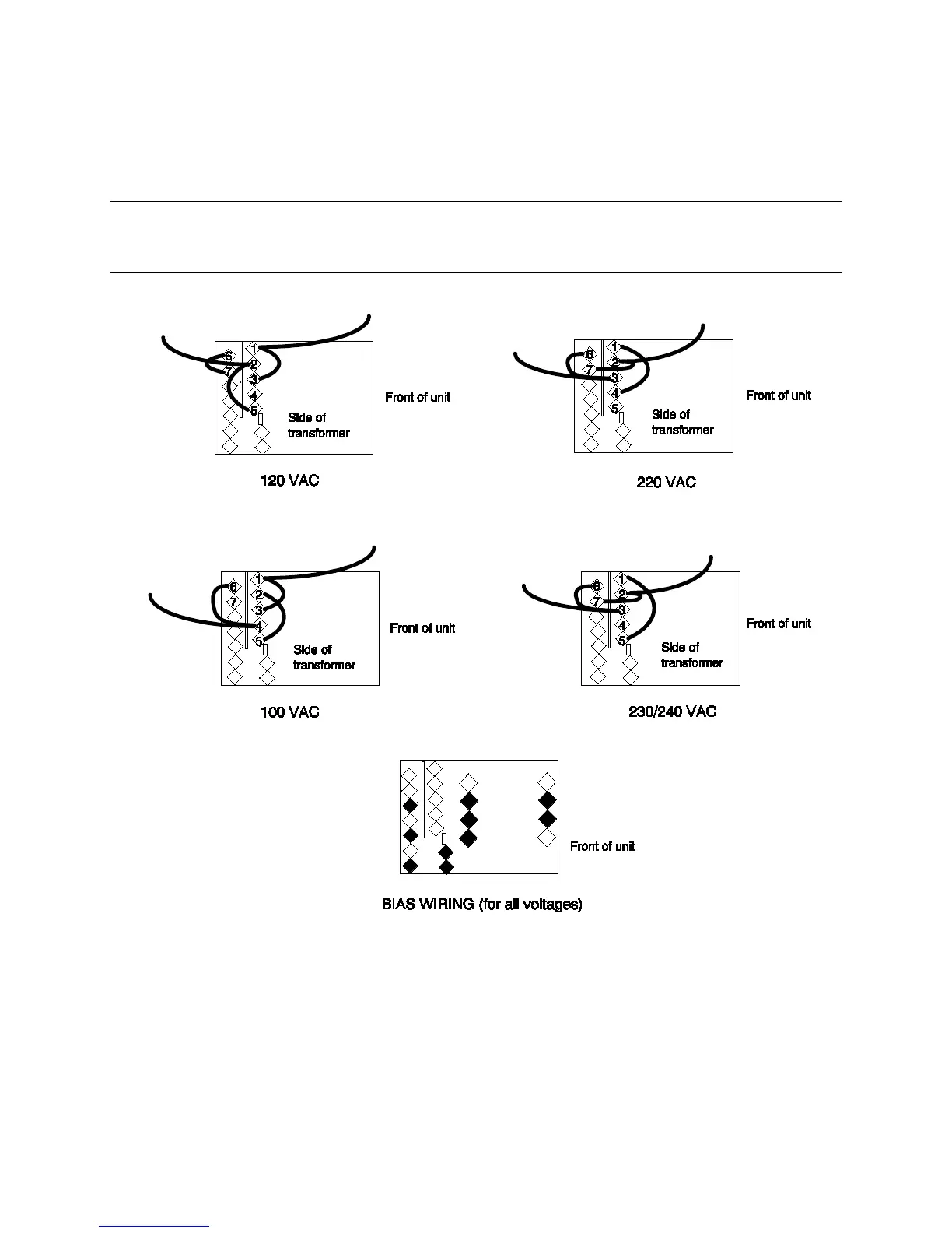 Figure 3-3 illustrates the primary wiring configuration of the power transformer for various ac line voltages. Use
