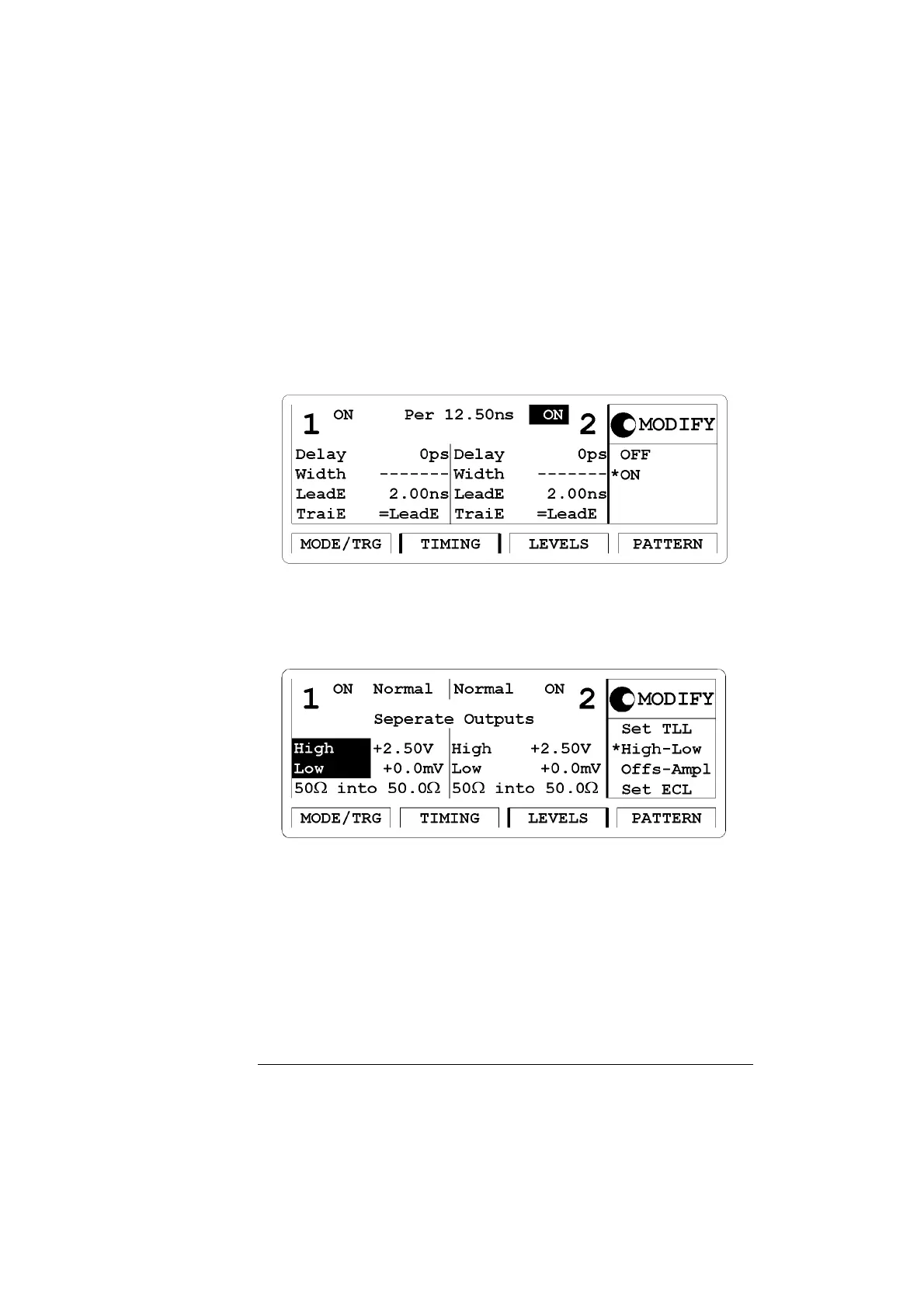 TE The TIMING and LEVELS screens for Agilent 81110A with