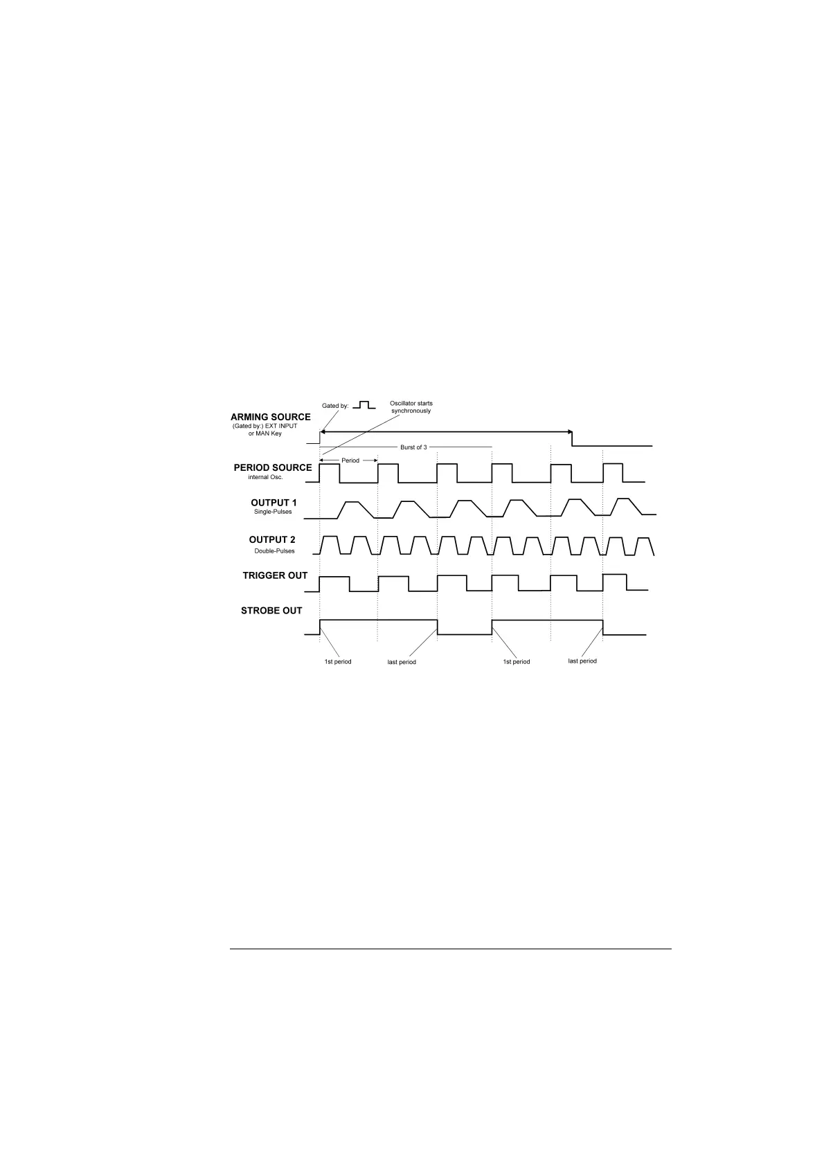 STROBE OUT rises at the start of the first pulse period in a burst and