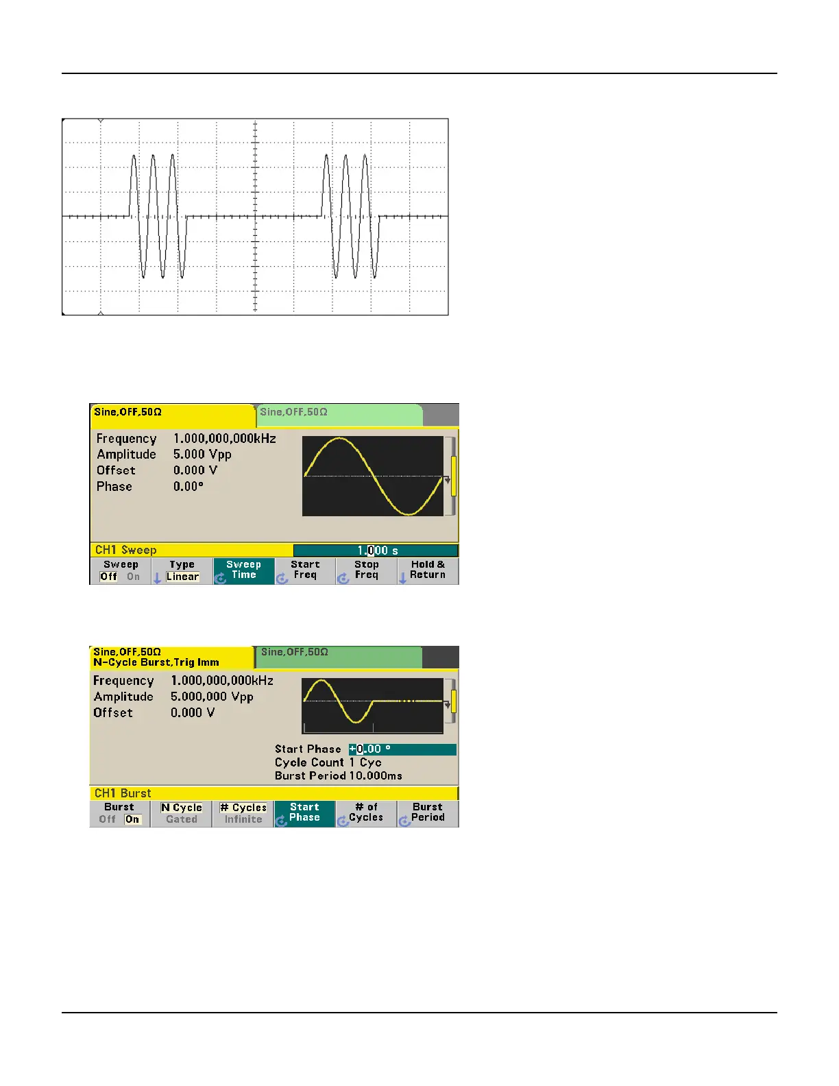Press Burst and then press the Burst Off / On softkey. Notice that a status message N Cycle Burst, Trig Imm