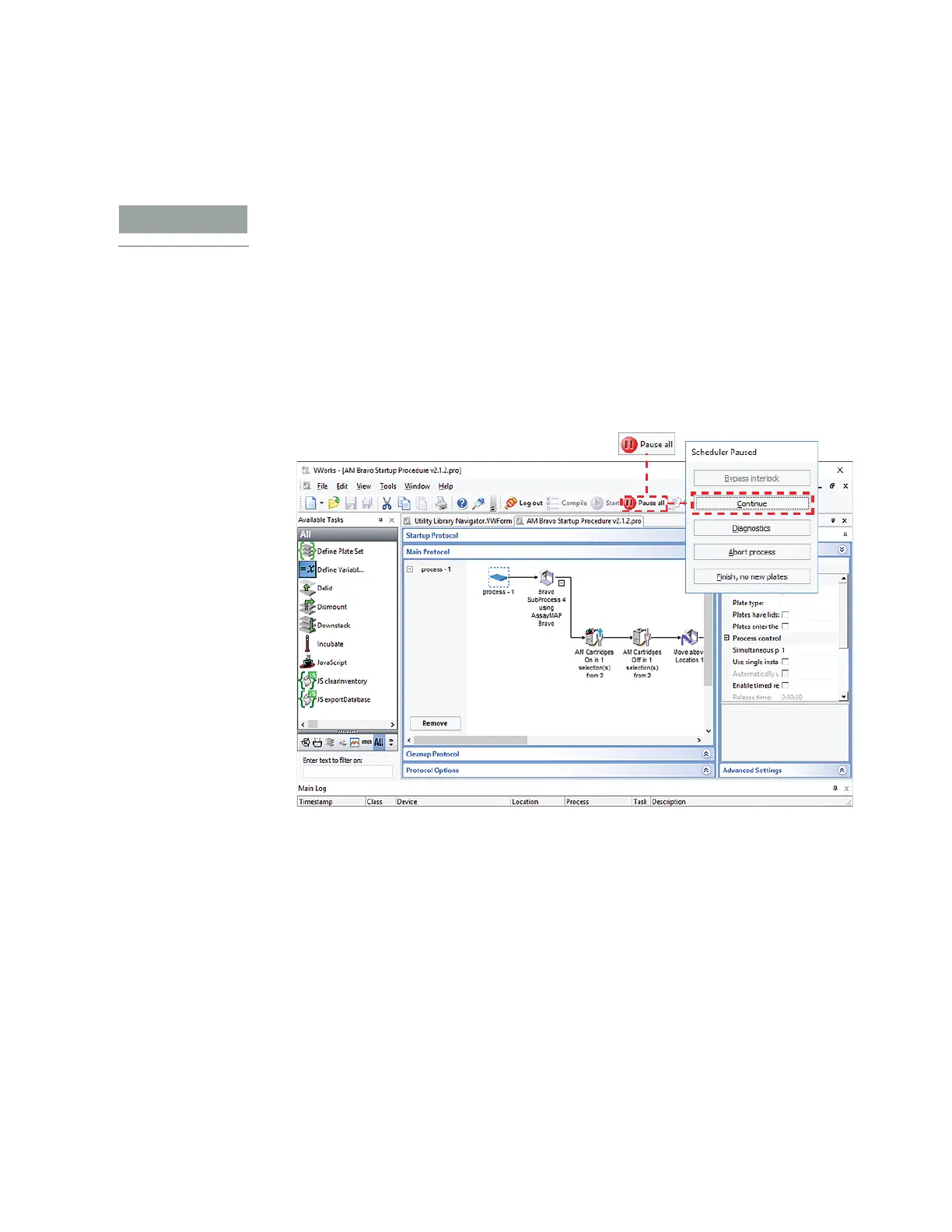 1 In the VWorks window, click Pause all.