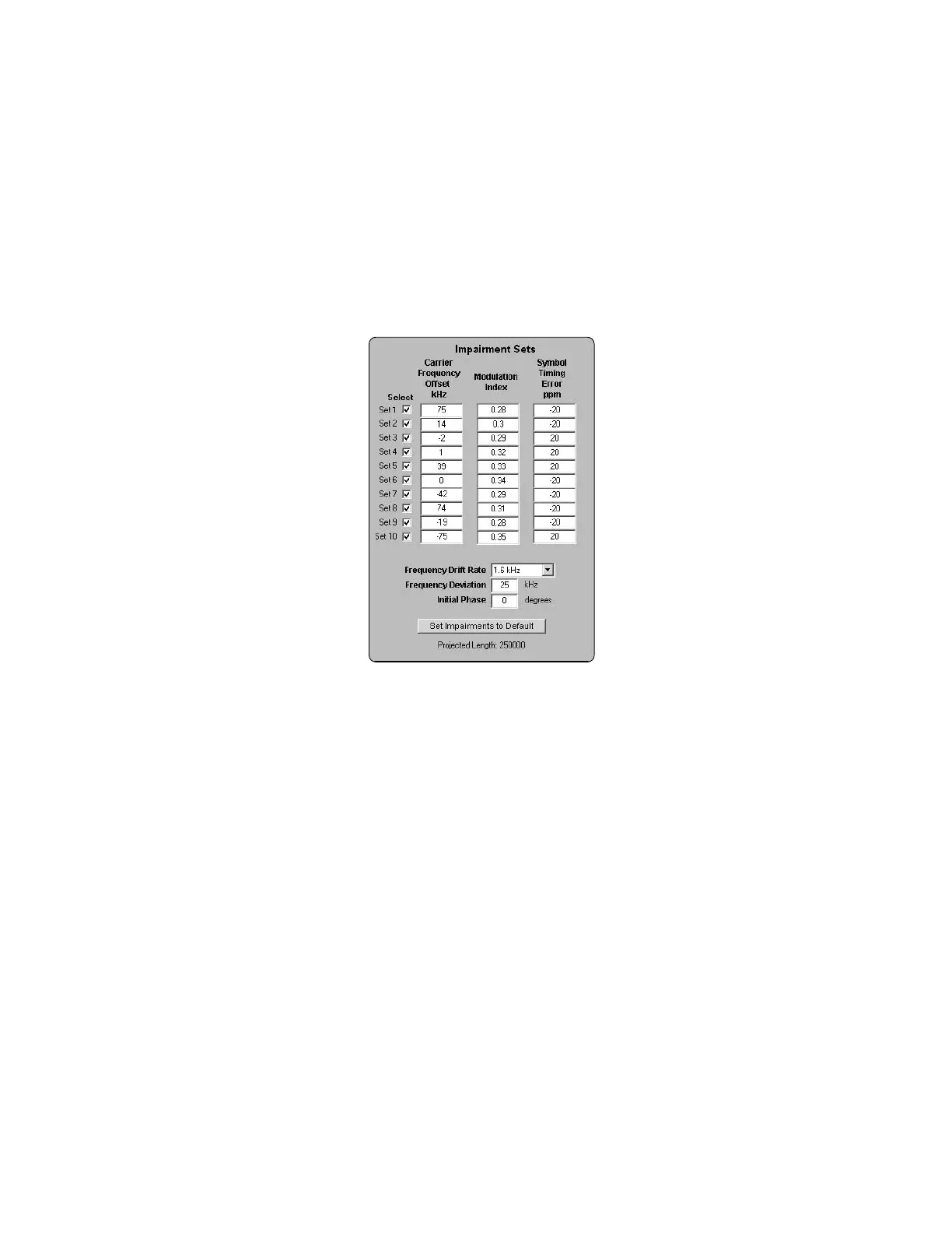 of tests called “Bluetooth Dirty Transmitter” tests. The default Impairment Sets, see