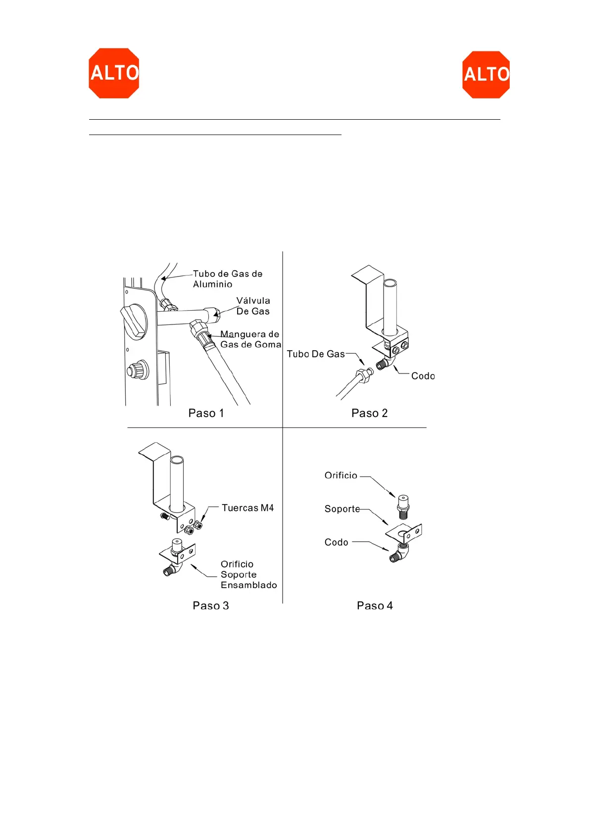 de M4 y tuercas. Conectar otra ves el tubo de gas de aluminio en el final del codo.