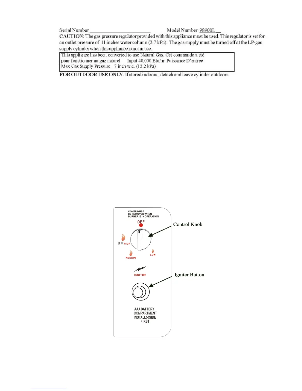 1. Locate the control and igniter panel. Make sure the control knob is in the “OFF” position. See Fig.
