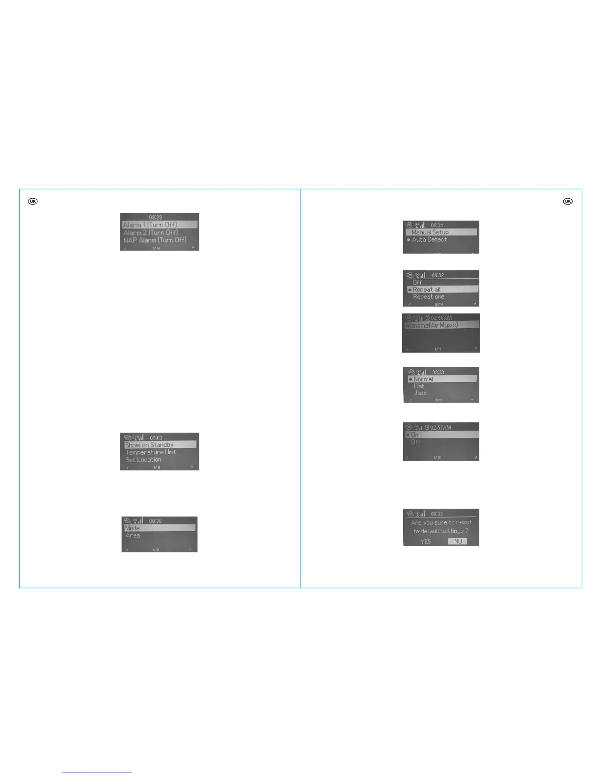 Restore the default settings. All stored WiFi access information, Internet Radio user login and FM presets will be
