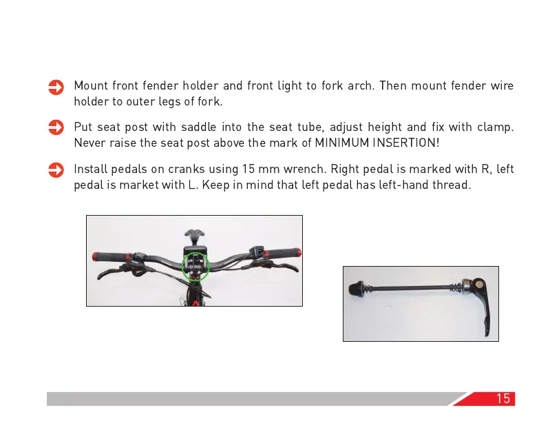 Install pedals on cranks using 1 5 mm wrench. Right pedal is marked with R, left