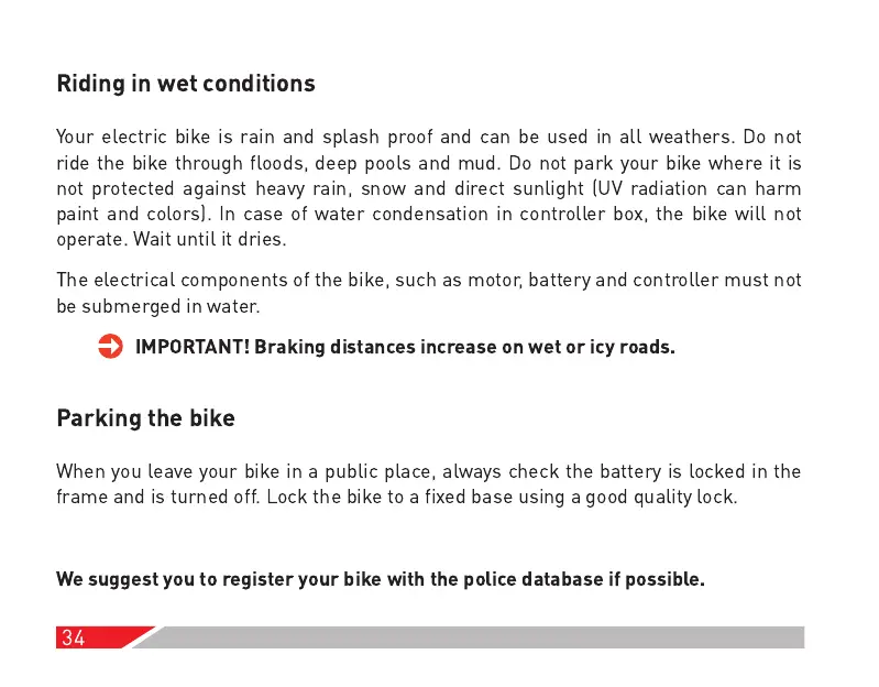 Your electric bike is rain and splash proof and can be used in all weathers. Do not