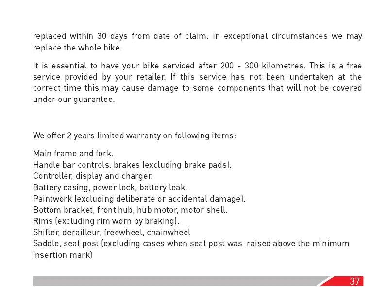 It is essential to have your bike serviced after 200 - 300 kilometres. This is a free