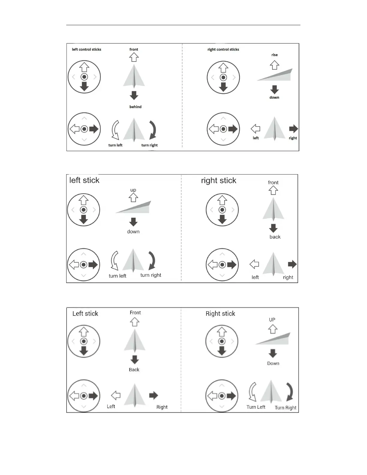 American hands: the left stick controls the drone's rise, down, turn left, and turn right, and the