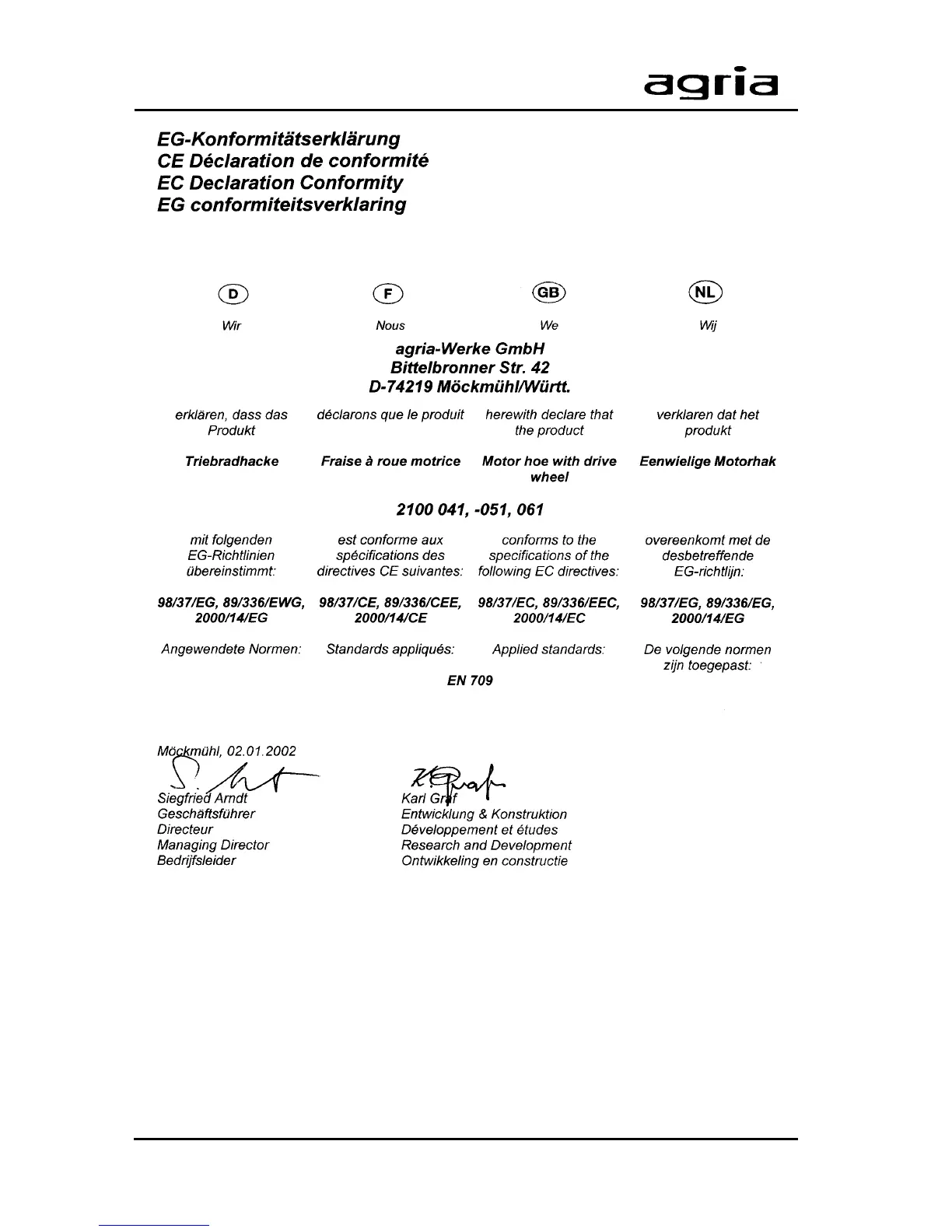 Agria 2100 - Conformity Declaration