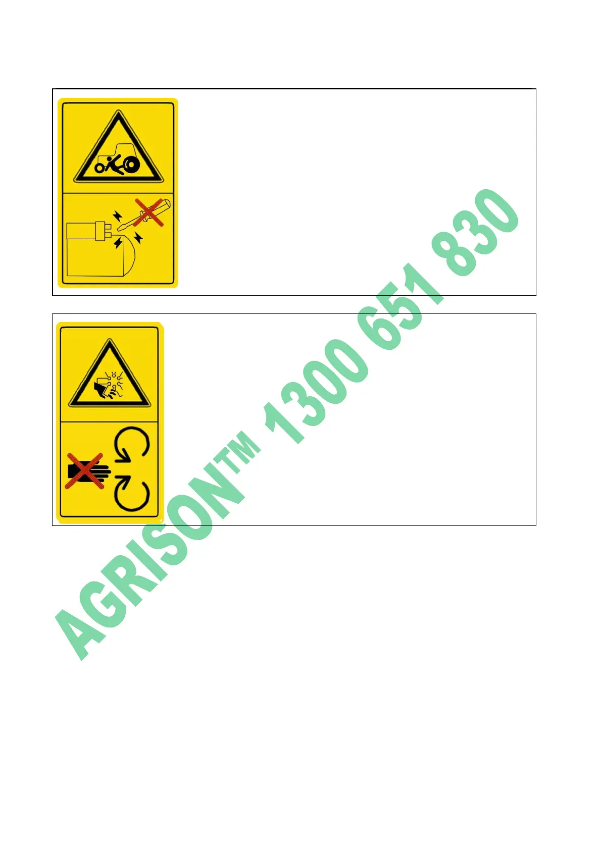 含义:发动机工作时,不要打开或拆下安全防护罩,且不要将手伸入工作区域,