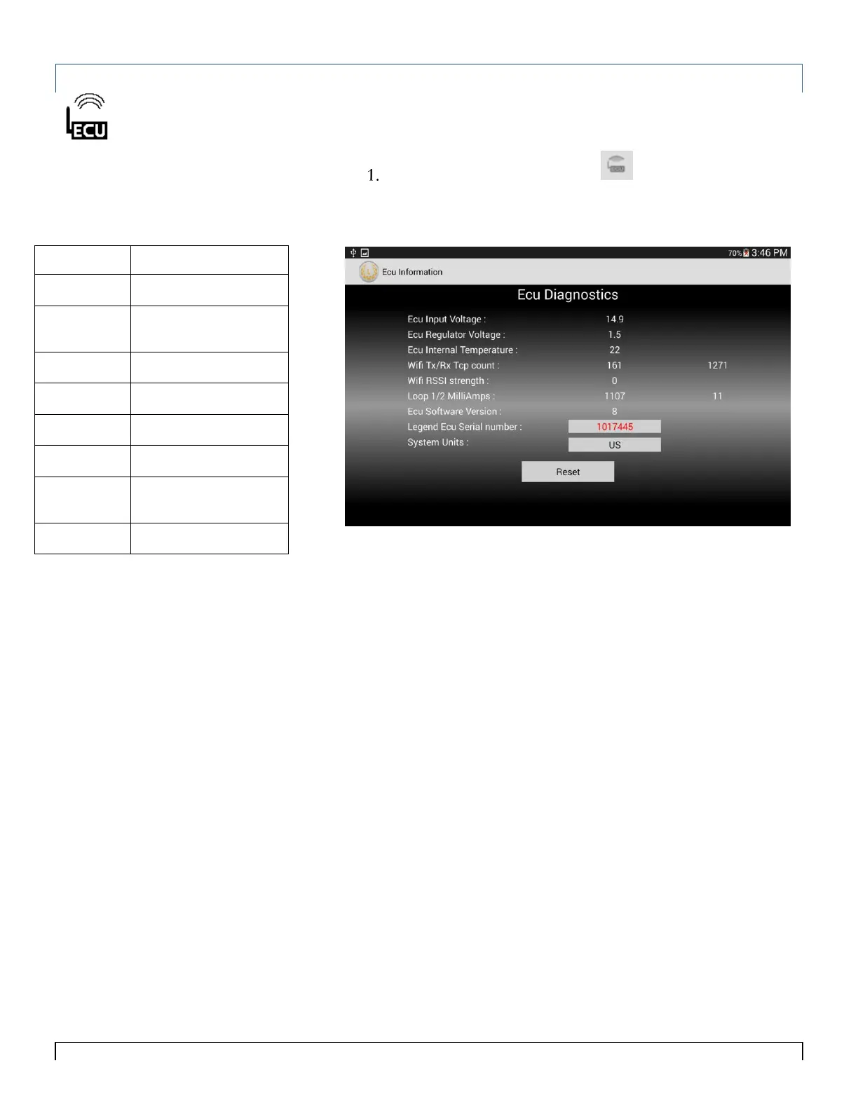 The ECU Diagnostics Screen provides information about the ECU.