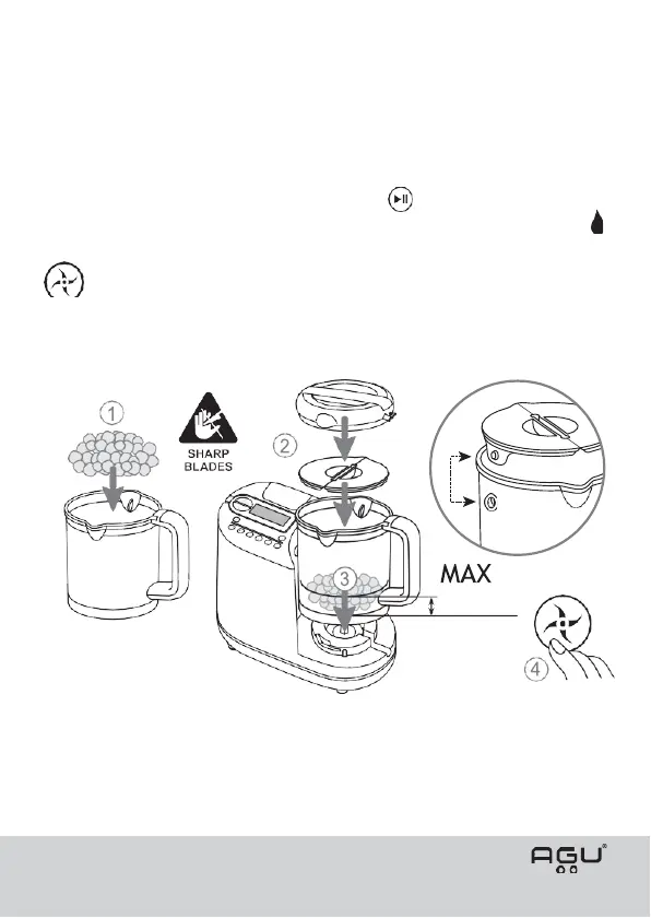 Asetage eelnevalt aurutatud või keedetud toiduained segamiskannu.