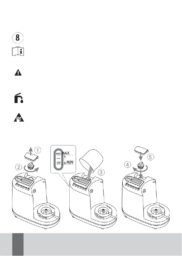 Retirez le couvercle du réservoir d’eau (2), en tirant avec précaution.
