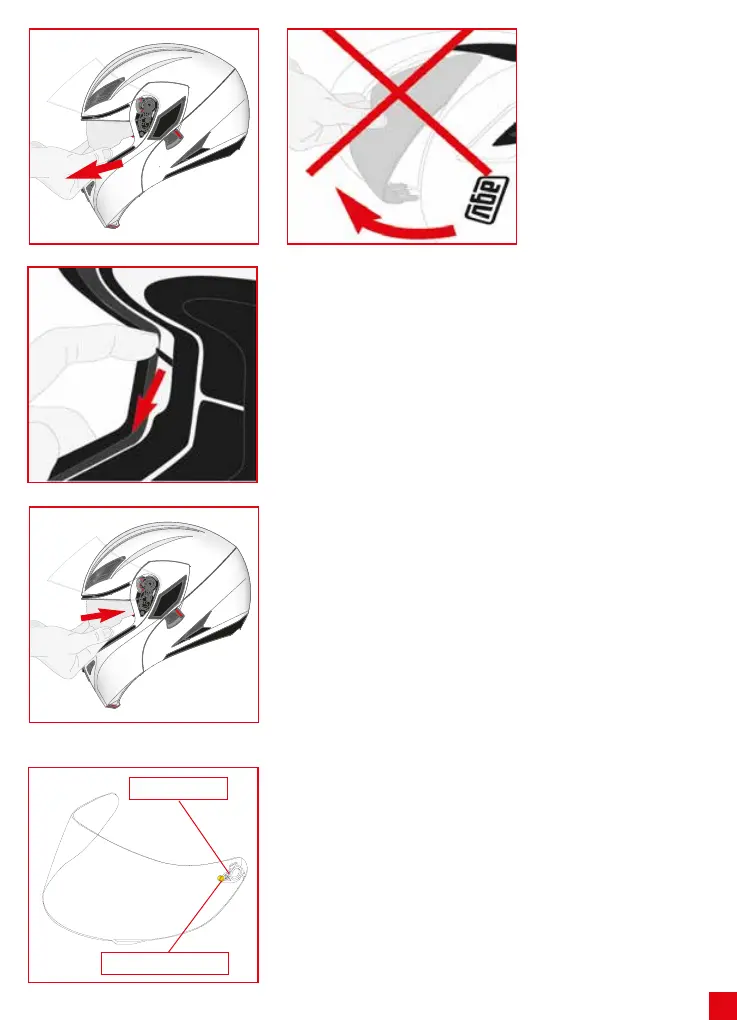 从头盔的一侧开始,护目镜完全向上打开,将遮阳板啮合插入其