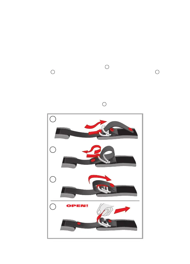 を解 放し、ストラップを弛 めま す。次に 赤いタブを 使 用して、リン グを通