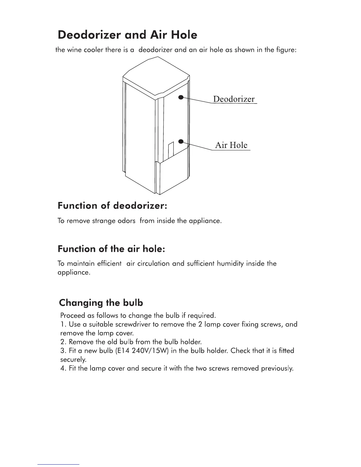 AHMA W85 - Deodorizer and Air Hole; Function of Deodorizer; Function of the Air Hole; Changing the Bulb