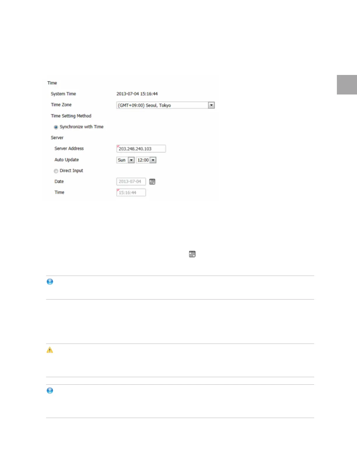 you choose to synchronize with the time server, specify the Server Address (203.248.240.103,