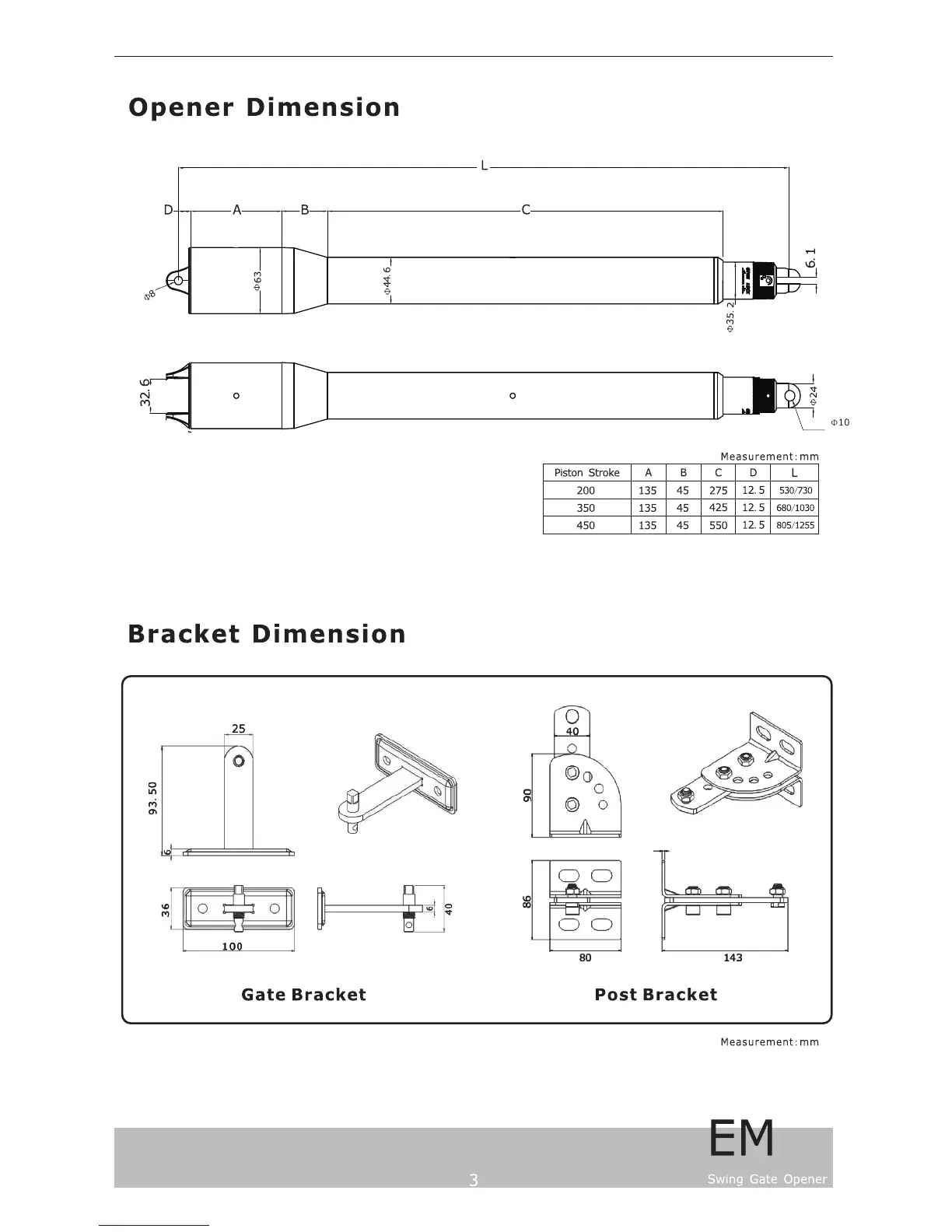 Ahouse EM - Opener Dimensions; Bracket Dimensions