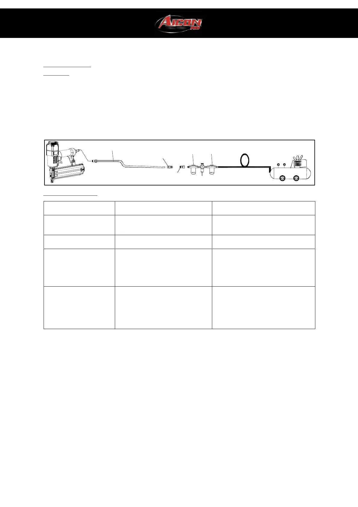 Air compressor: The air compressor must be able to maintain a minimum of 70PSI when the nailer is being used. An inadequate air